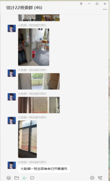 自11月6日开始,辅导员召开各班班委会,分配班委任务,提醒注意事项,每日复盘组织工作。班长发布重要通知,报告特殊症状学生并协助辅导员处理紧急事务;副班长收集核酸接龙和截图,寻找班级里的“滞后生”并重点通知;劳动委员落实宿舍卫生环境和口罩发放情况,早晚进行两次卫生巡逻并拍照;心理委员紧密关注心理危机学生,每人线上或线下关注1次;宣传委员做好班级的好人好事、先进典型的收集和报道工作;其余班委配合劳动委员完成卫生巡逻。