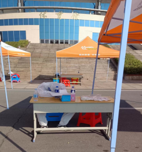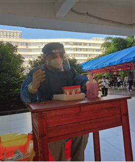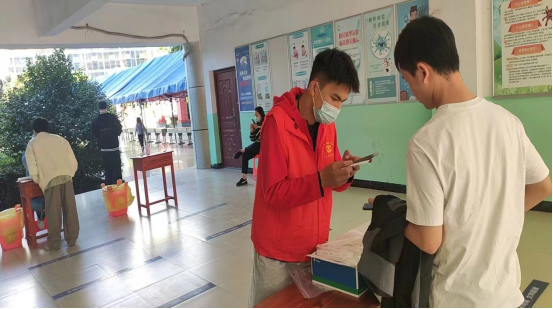 在核酸采样点,他友善提醒每一位来做核酸的同学戴好口罩,保持安全距离,打开健康码,一直不厌其烦的重复着,确保核酸采样工作高效有序完成。