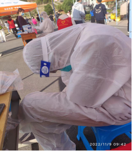 一晚上的不眠不休,他没有停止志愿服务的步伐,早晨五点多便又起床前往学校一食堂集合进行核酸志愿服务。由于前一天晚上没有充分休息,在检测空隙,趴在桌上就睡着了。