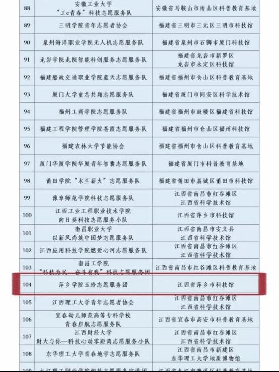 2022年全国大学生科技志愿服务示范团队旨在为推动高校大学生科技志愿服务专业化、规范化和常态化开展。由团中央青年志愿者行动指导中心、中国青年志愿者协会秘书处联合中国科学技术协会宣传文化部举办。活动面向全国征集遴选出300支全国大学生科技志愿服务示范团队。我校“玉玲”志愿服务团入选2022年全国大学生科技志愿服务示范团队。
