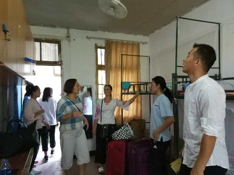 在新生宿舍,院领导仔细察看学生的住宿情况与生活情况,详细了解了各位新生的生源地、到校方式及其初来学校的适应情况,与新同学和部分新生家长进行了亲切的交谈,询问了新同学和新生家长们对于学校环境以及此次迎新工作的感受,并耐心地解答新生及家长提出的问题。院领导希望大家在今后的学习生活中,同学们一定要学会做人、学会生活、学会与人相处,遇到问题多与辅导员、班主任沟通,及时调整状态,尽快适应大学生活学习环境,同时鼓励同学们勤奋学习,愉快、充实的度过大学的黄金时光。