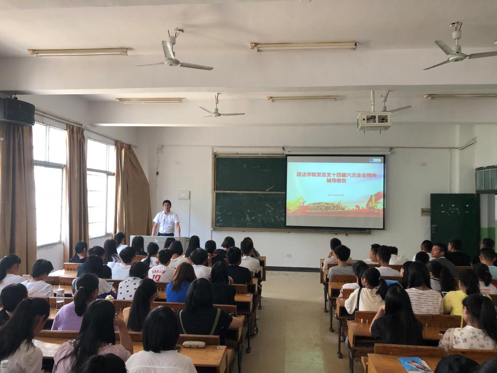2018年9月11日上午11点,政法学院迎新特色活动之一—传达学习江西省委十四届六次全体(扩大)会议精神在英华楼3106举行。辅导员陈尧嘉老师主讲,2018级新生及学生会部分学生干部、本科生党员参加会议。