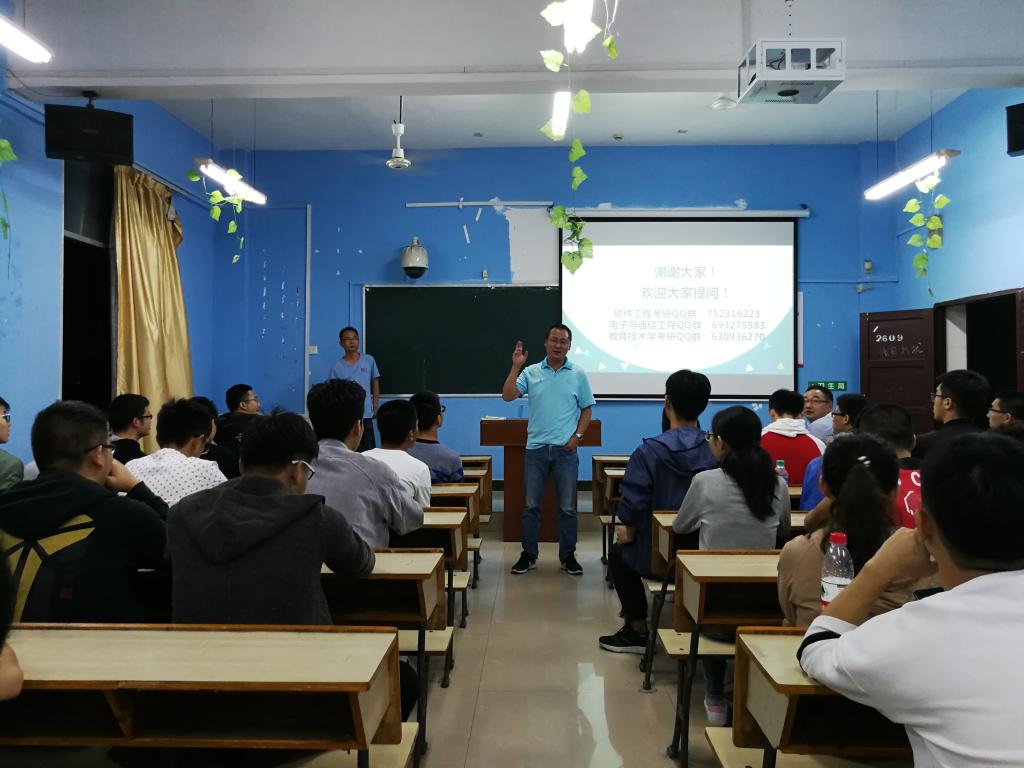 2018年9月29日下午,东华理工大学考研宣讲会于鼎新楼2314教室圆满召开。汪志成博士、谭海博士分别介绍了学校历史发展,对学校的国际交流和研究生奖学金进行了说明,同时向同学们展示了东华理工大学电子专业在省内所取得的优异成果。
