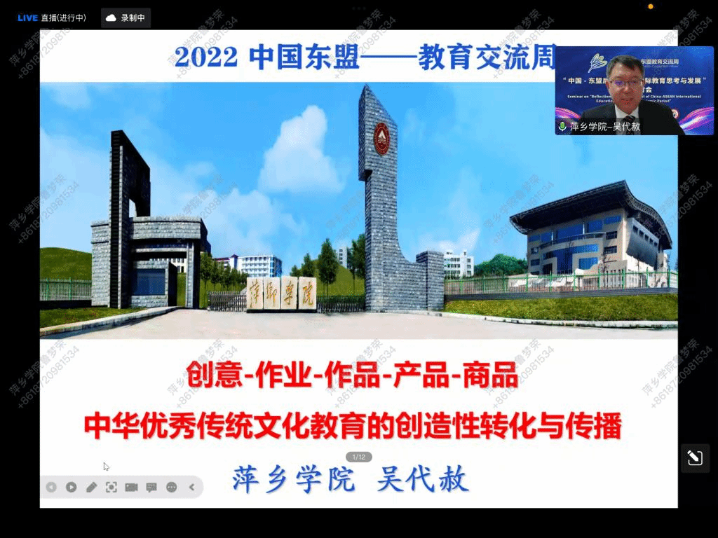 吴代赦从“历史悠久钟灵毓秀一脉相承传昭萍文化”“产学研用融合发展促进文化创造性转化”“作品变商品让文化传播插上腾飞的翅膀”三个方面,介绍了我校在传承、传播优秀传统文化所肩负的使命,勇于创新并成效显著。吴代赦向大家讲述了多个我校师生扎根昭萍大地,传播优秀文化、讲好中国故事、支撑产业发展的锐意创新和成功转化案例,洋溢着萍院人通过国际教育交流、“一带一路”等广阔平台,将中国、江西、萍乡极富魅力的文化传承下来,传播出去的自豪和自信。最后,吴代赦欢迎东盟各国朋友来校指导交流,并通过萍院的平台向中国展示他们的文化,继而通过“一带一路”向全世界传播。