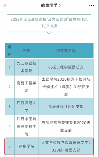 近日,团省委、省学联开展的江西省高校“活力团支部”“活力社团”风采展示活动结果公布,我校人文与传媒学院汉语言文学2020级1班团支部获评江西省高校最具好作风“活力团支部”,在全省众多团支部中突围,荣膺第五。