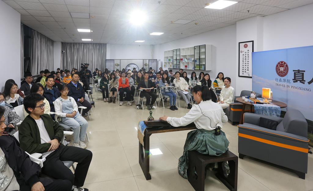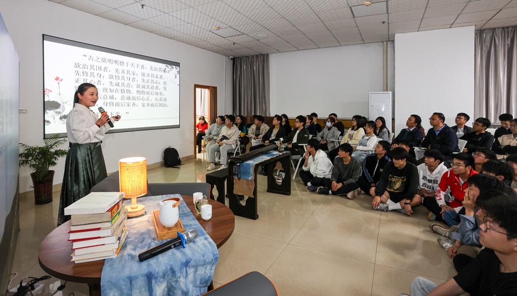 田常红以一首古曲《阳关三叠》开场,通过古琴的发展历史将大家引带入了中华优秀传统文化大观园。她从“文化密码”“中国哲学是生命哲学”两个方面,围绕中华文明的诞生及其源远流长的历史、学校楼宇名称出处和意义、关注成人之道等方面讲述了中华优秀传统文化的美丽所在。她表示,学以成人,应向天地万物、道家儒家学习,不管发生什么都以阳光成长的心态应对,焕发生命的生机与活力。同时,她还为同学们讲授成人之道:可以成长快乐,生机勃勃;可以视物常新,有发现美的眼光;可以与物为春,破除小我,以发展的眼光看待一切,保持赤子之心。