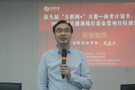创新创业学院副院长宋杰光为培训班致辞。他介绍了今年我校大学生创新创业大赛的参赛情况、项目情况及举办创新创业师资培训班的重要意义和目的。他指出,创新创业教师队伍是创新创业教育持续发展和取得实效的根本保证,创新创业师资培训是推进创新创业师资队伍专业化发展的有效措施,是我校未来推进产教融合、专创融合、科创融合的重要保障。