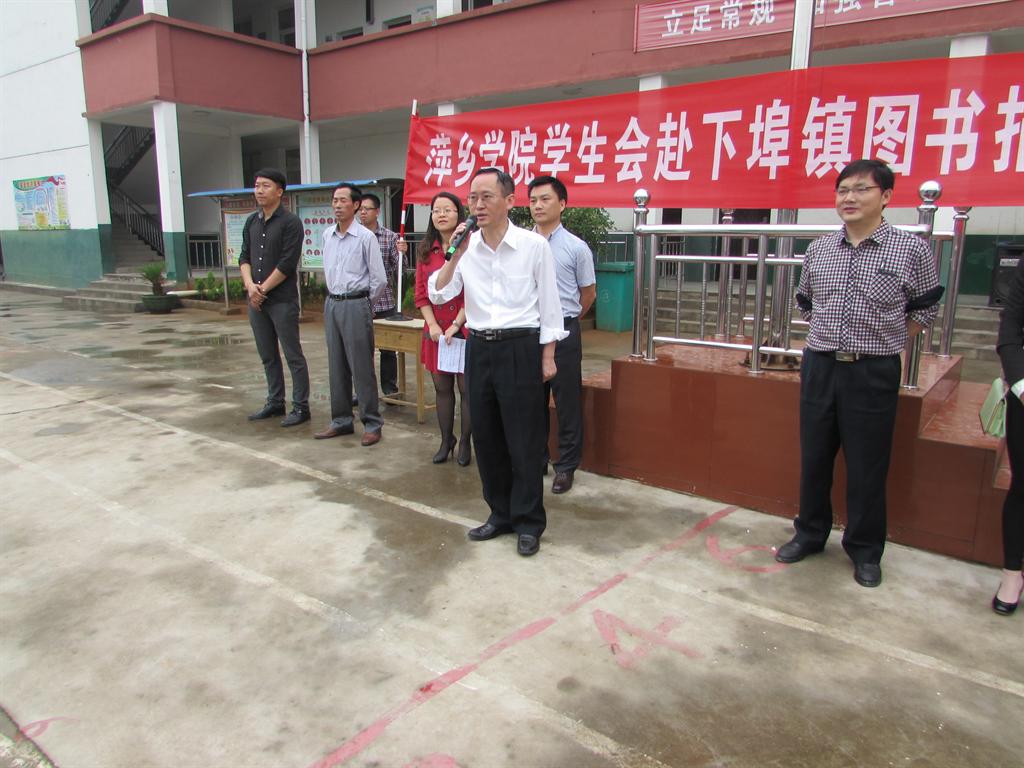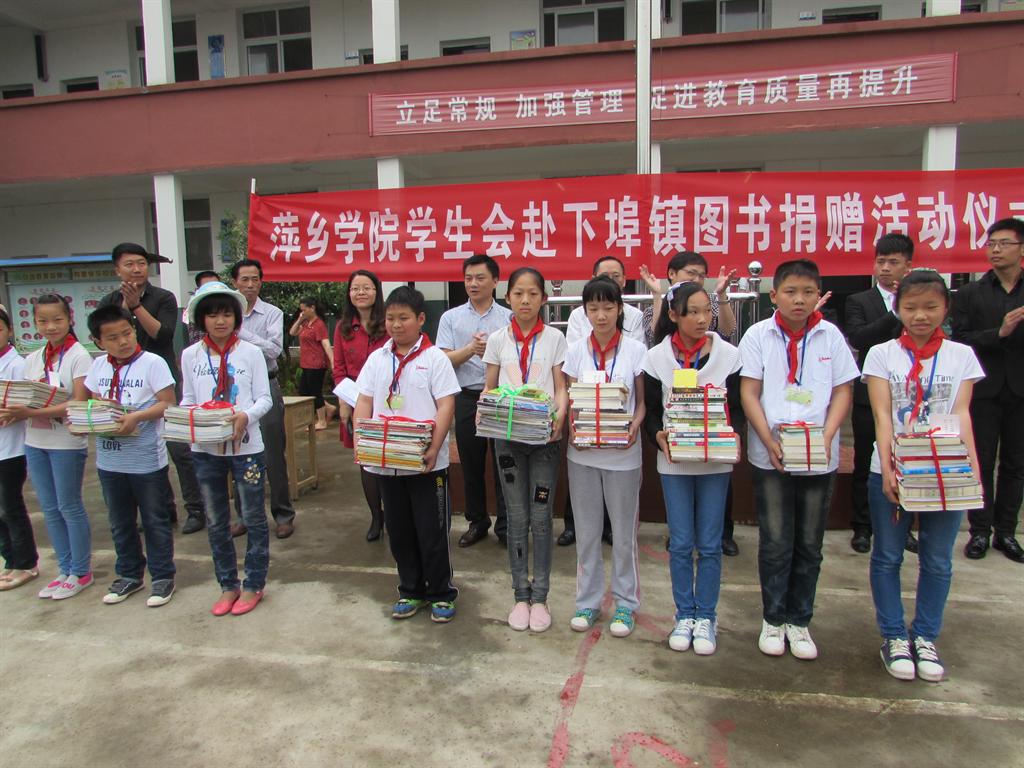 为弘扬“五四”精神,5月14日上午10点,萍乡学院学工处处长叶国许、学工处副处长丁勇带领萍乡学院校学生会成员前往湘东区下埠镇西源小学进行图书捐赠活动,湘东区教育局党委委员、副局长曾年华,下埠镇人大主席余海林,下埠镇党委副书记陈勇,下埠镇党委委员、组织委员黄薇,下埠镇党委委员、宣传委员陈乘、中共湘东区委驻下埠镇组织员段萍、下埠镇中心校校长黄建宏、下埠镇中心校党支部书记陈业、下埠镇西源村党总支书记钟存芳、下埠镇西源村村长刘建军、下埠镇西源小学校长黄伟出席了此次活动,此次一行受到当地领导和老师热情的接待与欢迎。
