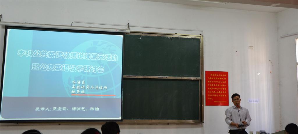 为加强我校英语教学内涵建设,提高本科公共英语教学质量,推进全校公共英语教学改革,由萍乡学院外语系、高教研究与评估所、教务处主办的本科公共英语教师说课展示活动暨公共英语教学研讨会5月20日下午在英华楼3312举行。莅临本次会议的领导有校长刘明初,校党委委员、宣传统战部部长陈永国,教务处、高教研究与评估所、外语系负责人易逢荣、易志文、欧阳咏梅、黄柏萍、贺晓梅、刘佳萍、王强及全校英语教师参加活动。本次活动分为“本科公共英语教师说课展示”和“公共英语教学研讨会”两个部分,分别由外语系主任欧阳咏梅、高教研究与评估所所长易志文主持。