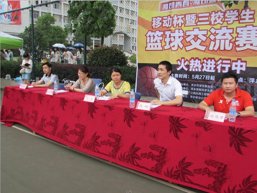 此次篮球赛开幕式于2014年5月27日下午2:30,在我校室外篮球场举行,出席本次开幕式的领导有:团市委学少部部长、市学联秘书长梅岭,江西应用工程职业学院团委书记苏帆,萍乡学院学工处副处长刘文萍,萍乡学院团委副书记谢伟萍,江西应用工程职业学院学工处副主任陈爱军,萍乡市学生联合会驻会主席罗兴宇。来自三校的篮球赛队员及学生参加了此次开幕式。