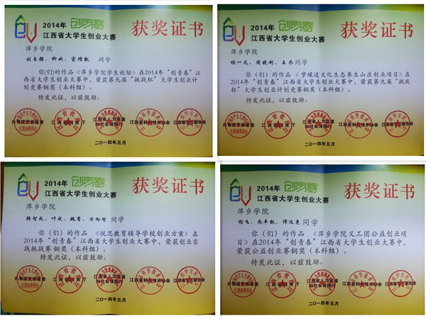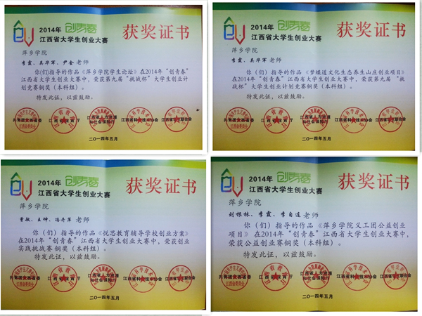 在校团委和经管系的精心组织下,由我校报送的《萍乡学院学生论坛》、《梦蝶道文化生态养生山庄创业项目》、《悦思教育辅导学校创业方案》、《萍乡学院义工团公益创业项目》共四件作品分别荣获本科组铜奖。
