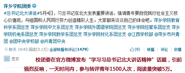 习近平总书记5月4日在北京大学考察时的重要讲话,在江西萍乡学院师生中引起强烈反响。这两天,该学院广大青年学生通过电视、报纸、微博、微信、专题网站等媒介认真学习讲话精神,大家纷纷表示,习近平总书记的重要讲话体现了党中央对青年学生的关怀和厚望,广大青年学生要按照习近平总书记的要求,勤奋学习、崇德修身、明辨是非、笃实力行,自觉践行社会主义核心价值观。以此为契机,该学院探索建立“四个融入”模式引导青年学生自觉践行社会主义核心价值观。