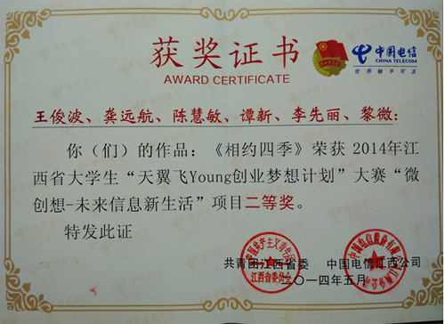 5月12日,由团省委、中国电信江西分公司联合举办的“天翼飞Young创业梦想计划”大赛颁奖仪式在江西师范大学举行。副省长胡幼桃、省政府副秘书长林彬杨、团省委书记曾萍出席并为获奖选手颁奖。我校王俊波团队创作的微电影《相约四季》得到了评委认可,在“微创想-未来信息新生活”项目中荣获二等奖。
