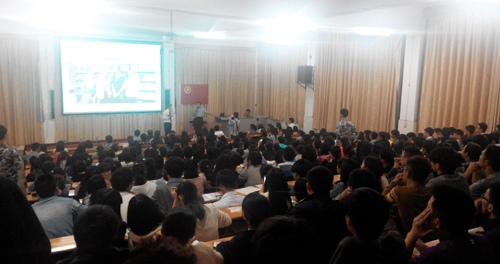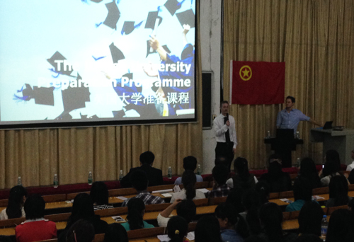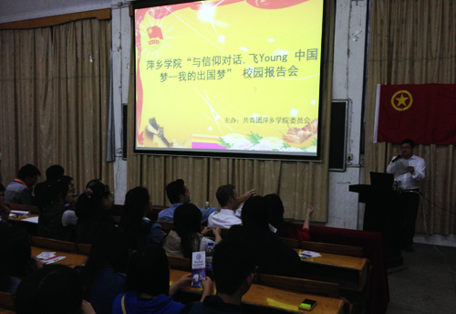 4月4日晚,校团委在跬步楼1101教室举办了“与信仰对话,飞young中国梦——我的出国梦”校园报告会,来自英国的Sam Hum和Chris Thomas主讲《中英教育的对比》。外语系党总支书记黄柏萍、校团委书记刘德平、外语系党总支副书记刘佳萍以及校团委学生干部、各系学生代表400多人参加,校团委副书记谢伟萍主持报告会。