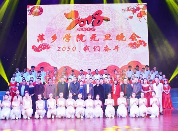12月28日晚,由校团委、学工处承办,校艺术团、校社团联合会协办的 “2050,我们奋斗”元旦晚会在音乐厅隆重举行。党委书记陈金印,校长史焕平,党委副书记蔡宝琦,党委委员、副校长郭伟,党委委员、副校长邱建丁,党委委员、纪委书记潘运华,党委委员、副校长刘卫林,党委委员田常红,党委委员、组织部部长陈永秀,党委委员、宣传统战部部长陈永国以及参加萍乡学院校企合作协同创新座谈会的社会各界来宾、学校中层正职、师生代表共计1000多人观看了晚会,大家在热闹非凡的氛围中喜迎新年。晚会伊始,校长史焕平发表了热情洋溢的新年致辞。