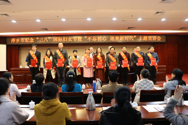 3月5日,萍乡市纪念“三八”国际妇女节暨“不忘初心逐梦新时代”主题宣讲会在市行政中心中会议室隆重召开。全市各级妇联干部和妇女工作者、各界优秀妇女和女性社会组织代表、市妇联执委、受表彰的先进典型代表等共计180余人参加大会。会上隆重表彰了萍乡市先进典型。