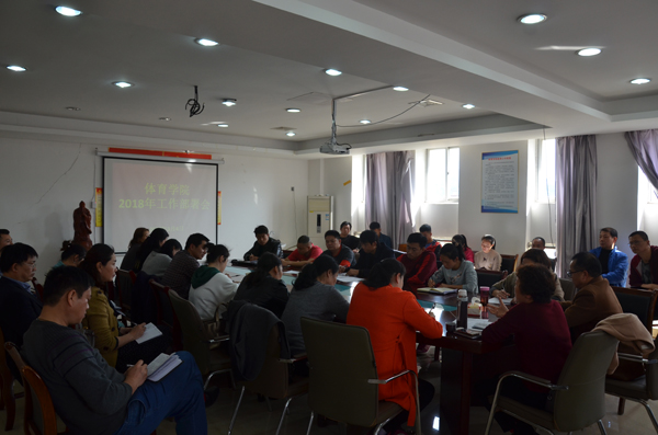 ——体育学院召开新学期工作会议。为了确保新学期工作的顺利进行,体育学院于3月4日下午在学院二楼会议室召开2017-2018学年第二学期新学期工作部署会议,体育学院全体教职员工参加。会上,院长易淑梅宣布了学院行政领导成员分工调整。书记周为谋传达了学校2018年工作部署会议精神及院党建工作的布置。负责教学工作的严五四老师宣布了本学期各任课教师的教学工作安排。副书记文娬进行了本学期学生工作的布置。最后,院长易淑梅结合学校工作要点对体院2018年各项工作进行了详细部署。(彭苏建)