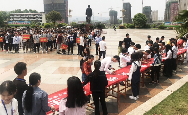 为创建文明美丽校园,增强大学生爱护校园环境意识,实现以优美的环境熏陶人、感染人、影响人和教育人,以更好的精神风貌迎接教育部本科教学工作合格评估。4月2日中午,我校在毛泽东铜像广场开展了“把清洁环境留给别人,争做文明大学生”签字活动。校团委班子成员、校学生会全体成员以及各二级学院团总支学生分会主席,各班班长、团支书共计500多人参加了此次活动。