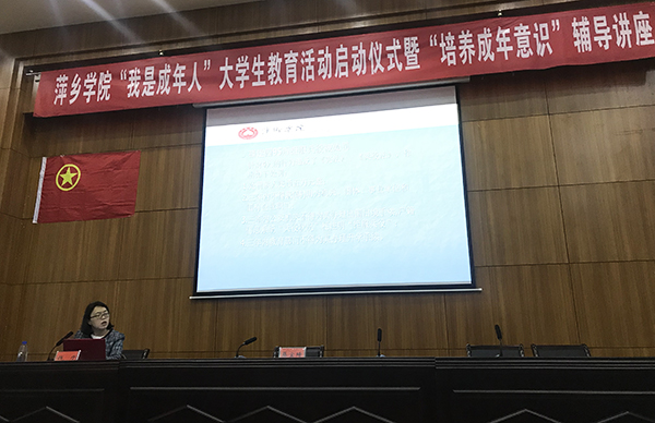 仪式上,学工处负责人宣读了《萍乡学院“净化教室、亮化寝室、美化生活”活动方案》;校团委负责人宣读了《萍乡学院“我是成年人”大学生教育活动实施方案》;政法学院副教授钱力作了《培养成年意识》主题讲座,带领大家重点学习了《宪法》《民法》《刑法》等法律法规有关“成年”的法律条文,引导大学生树立“成年”概念、增强“成年”意识、担当“成年”责任。