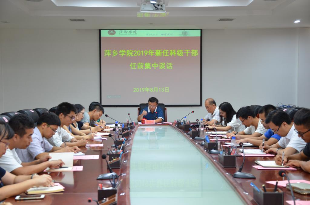8月13日下午,学校对新任科级干部开展任前集体谈话。党委副书记蔡宝琦,党委委员、纪委书记潘运华,党委委员、组织部部长陈永秀出席会议,2019年新提任的33名科级干部参加会议。会议由党委副书记蔡宝琦主持。