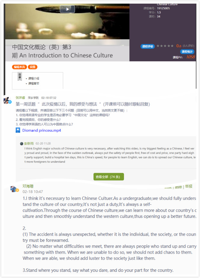 外国语学院还根据学生学习特点,利用线上教学资源,在疫情特殊时期加强学生的课程思政,精心为学生挑选了《中国文化概况》(英文版)国家优秀精品课程,要求学生完成相关作业和测试,以增强大学英语课程的思政性和趣味性,让学生在国家这个特殊时期,进一步增强他们的文化自信、民族自信。