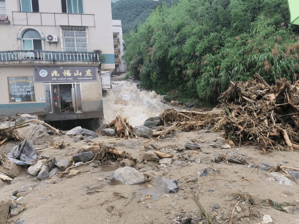 驻村工作队冒雨安全赶到龙王潭村时,了解到该村关山组居住的7户32名村民被洪水围困,其中一户贫困户房屋被大水冲垮,形势十分严峻。工作队马上组织熟悉地形的村民开辟山路,和村委会干部一道,将32名村民安全转移到村委会办公楼内,随后迅速开展受灾群众安置工作。工作队分工合作,安抚受灾群众的情绪,采购肉、蛋和蔬菜,搭建炉灶、组织村民做饭,及时解决温饱问题。同时协调受灾群众暂时安置在村委会旁的民宿内居住。接下来,工作队马不停蹄巡查村的河道和道路排查安全隐患,并为危险路段设置路障和警示标志,安排挖掘机对村主要道路进行疏通,在下午五点回复了主要公路的交通畅通,为下一步的灾后恢复重建提供基本保障。
