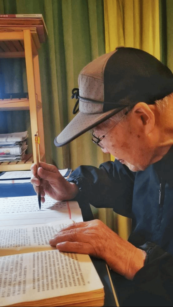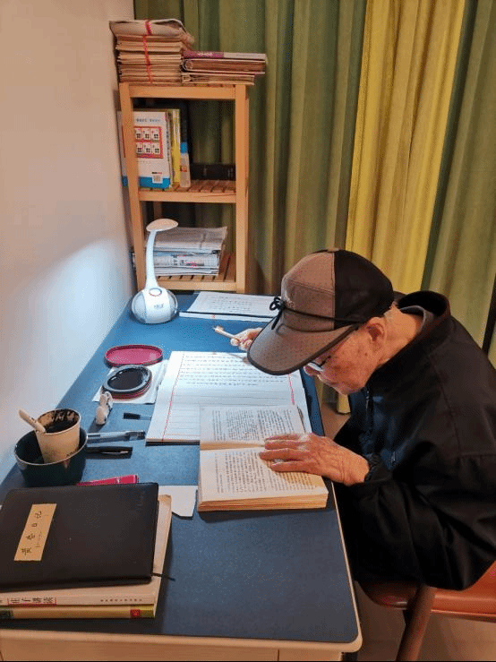 为便于照顾老人,漆老的小儿子萍乡市经开区教育局书记漆跃峰将漆老接到自己家中同住,民盟萍乡学院委员会一行三人的到访得到了漆书记一家人的热情招待。大家刚进门就被眼前看到的一幕景象而感动,93岁高龄的漆老正伏案手录刘勰的《文心雕龙》,一丝不苟,聚精会神,有点耳背的漆老,竟未察觉大家的到访,也让大家有幸见到了漆老现场书写一手极其工整漂亮蝇头小楷的场景。