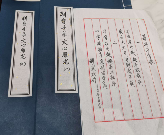 漆老一直都保持着很好的生活习惯,早上6点半起床,自己按摩半小时,晚上看完《新闻联播》即上床休息。此外,漆老至今仍有着良好的读书写字习惯。他向大家介绍自己喜欢读《论语》、《孟子》、《庄子》和《文心雕龙》,其中最喜《庄子》,尤其为《庄子》中洋溢的乐观精神所打动。漆老坚持每日写毛笔字1小时,或戏作小诗、或手录经典,大家到访时,漆老的《耕叟手录文心雕龙》已完成厚厚两册。字如其人,一丝不苟;诗如其人,豁达乐观。