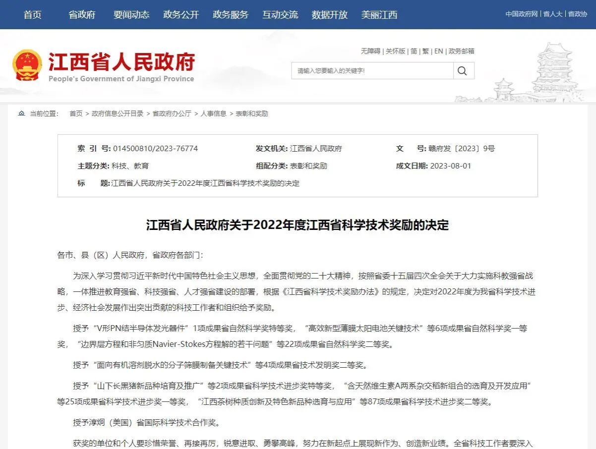 2023年8月5日,《江西省人民政府关于2022年度江西省科学技术奖励的决定》(赣府发〔2023〕9号)发布,公布了2022年度江西省科学技术奖名单。我校校长刘林芽、材化学院院长王献忠科技成果分别获2022年度江西省科学技术进步一等奖和二等奖。获奖项目如下: