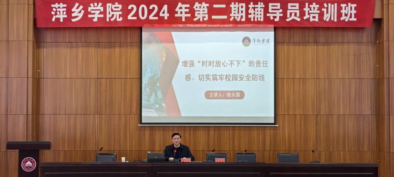 为深入贯彻习近平总书记关于安全生产重要指示精神,着力提高师生安全防范意识,强化自我防护能力,筑牢安全稳定防线,防范各类安全事故。3月8日上午,我校在至善楼学术报告厅举办2024年第二期辅导员培训班。校党委委员、副校长陈永国、刘培圣出席培训并讲话。学生工作处和保卫处有关同志,二级学院党委副书记、学工科长、专兼职辅导员参加培训班。