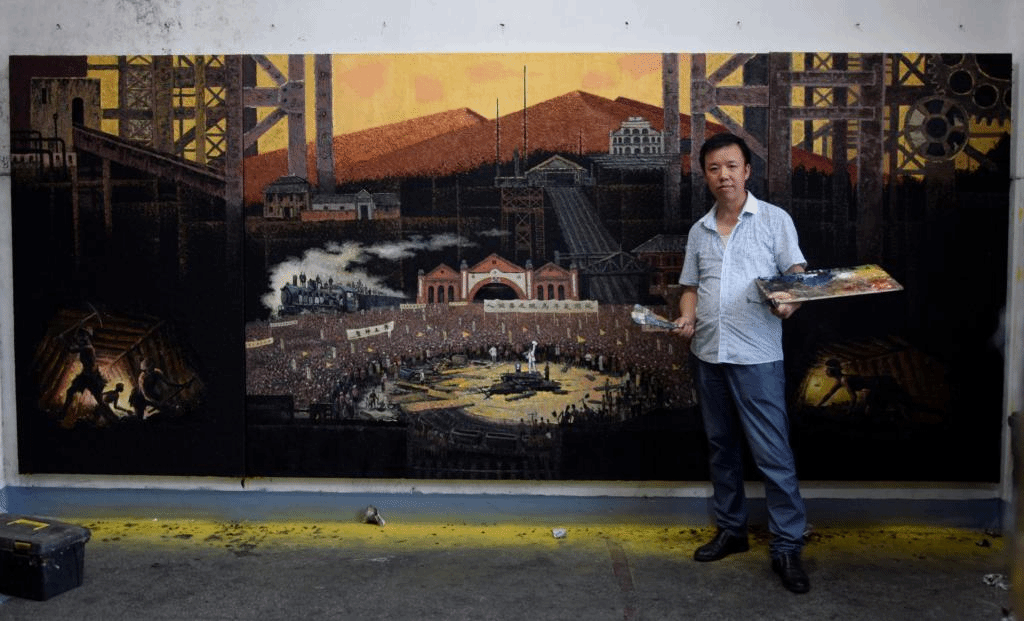 唐柏林说,我画的是《安源路矿工人大罢工》,习总书记曾在讲话中提到过安源精神,我从领会安源精神的内涵入手,用画面表达中国工人阶级在近百年来发愤图强,追求民族复兴的伟大创举。安源煤矿是清代末年汉冶萍公司的重要组成部分,汉冶萍公司是中国旧知识分子为了抵抗外敌,穷则思变,探索产业经济的救国途径。而安源路矿工人大罢工,是在中国共产党的领导下,工人阶级开始觉醒,中国革命走向波澜壮阔的正确道路,从而挽救了中华民族的命运,使中国真正走向了伟大的民族复兴之路。