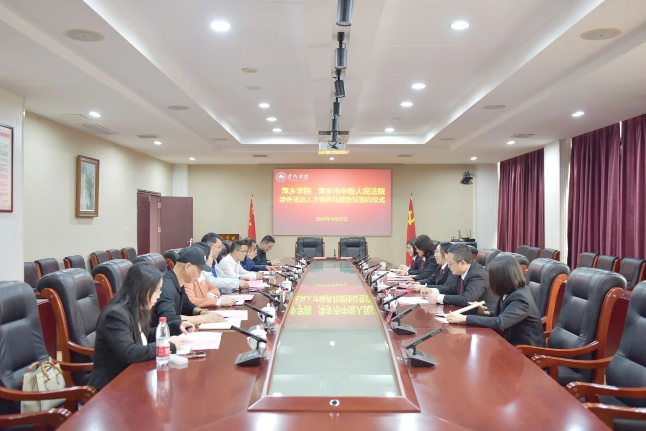 4月22日下午,我校在至善楼第一会议室与萍乡中院“涉外法治人才培养共建”举行项目签约仪式。副校长吴代赦、萍乡中院副院长胡媛娟出席项目签约仪式。