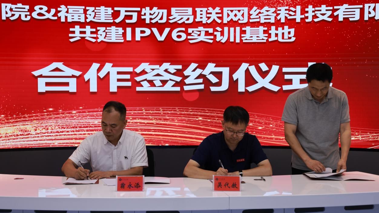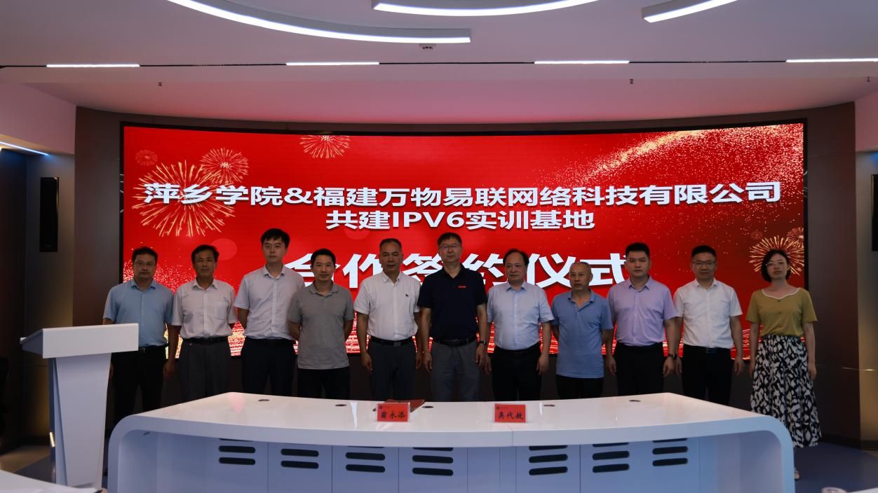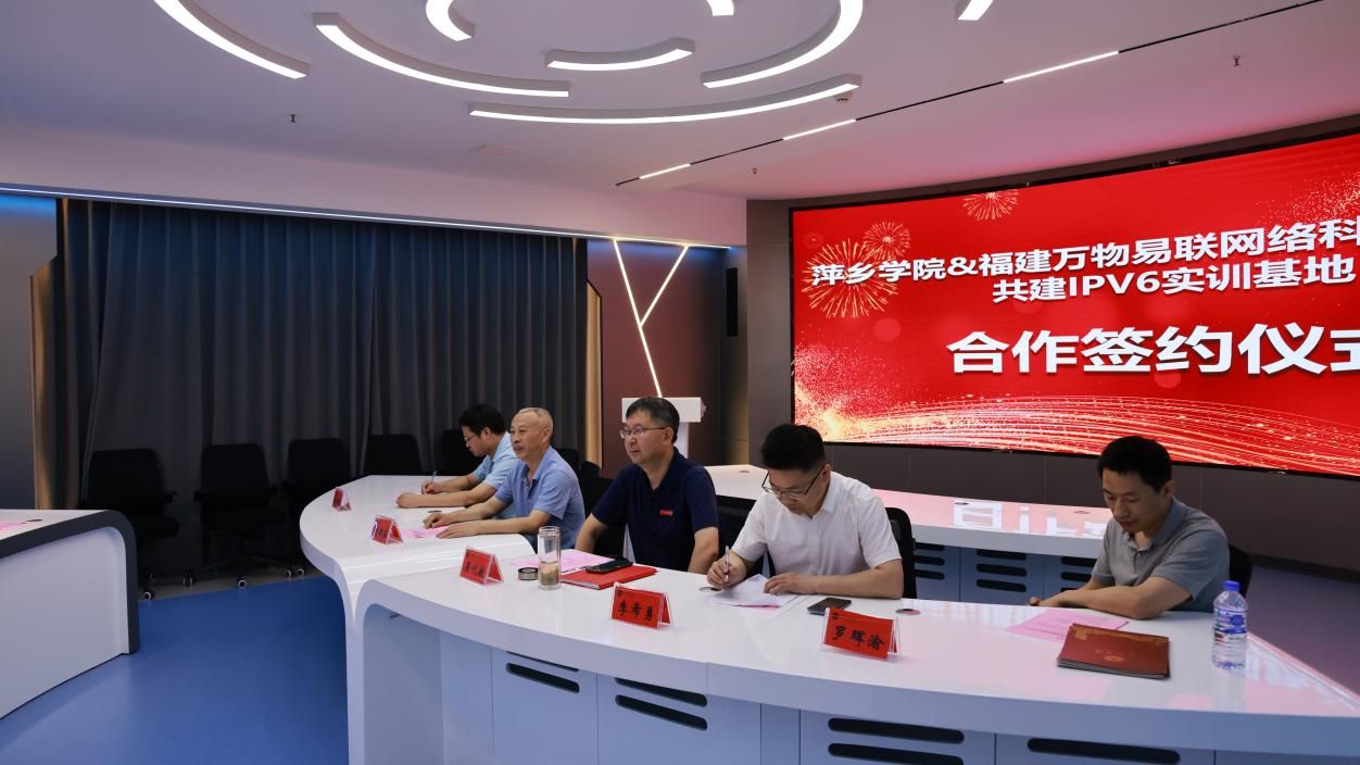 6月13日,萍乡学院与福建万物易联网络科技有限公司共建IPv6实训基地签约仪式在学校天泉楼举行,副校长吴代赦、萍乡市委网信办副主任欧阳海涛、福建万物易联网络科技有限公司董事兼副总裁翁永添、福建万物易联网络科技有限公司江西办负责人刘凯出席签约仪式,吴代赦代表萍乡学院、翁永添代表福建万物易联网络科技有限公司进行了现场签约。萍乡市委网信办综合科科长黄灿、信息与计算机工程学院党委书记周锦春、副院长(主持工作)李希勇、罗珲渝博士、办公室主任彭新平、教学科研科科长孙正广等参加活动。签约仪式由罗珲渝主持。