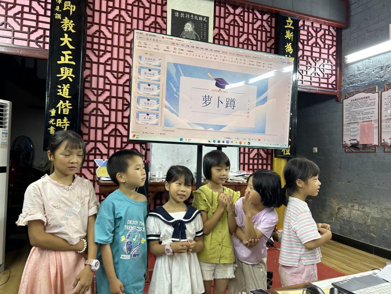 全神贯注,心无旁骛。孩子们在国学馆中分组进行“萝卜蹲”游戏。各组“萝卜”按照规则念口令。他们全身心投入游戏之中,展示出惊人的团队协作能力和反应速度。每当有孩子出现失误时,都会引来其他孩子和志愿者老师们的欢笑和鼓励,现场氛围十分热闹。