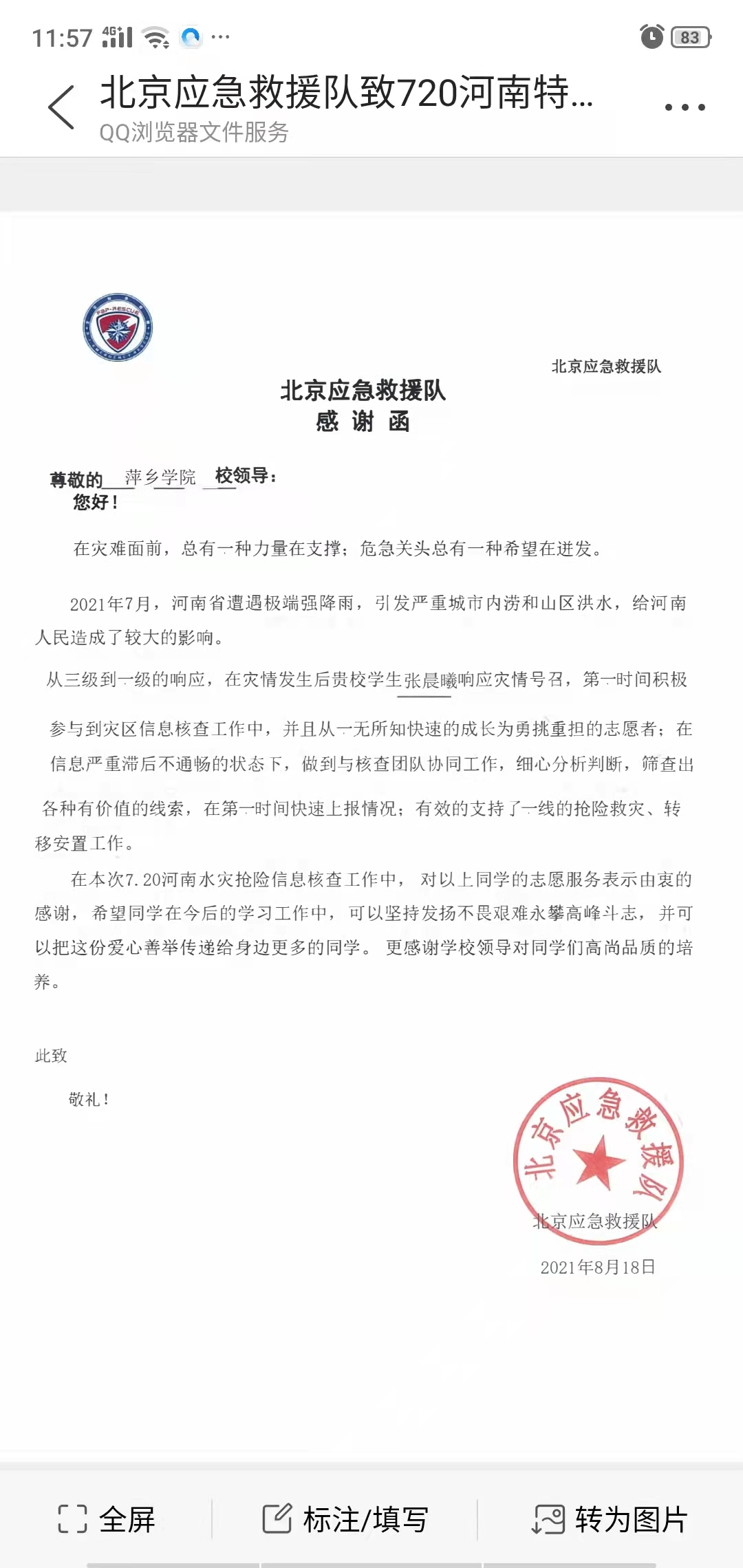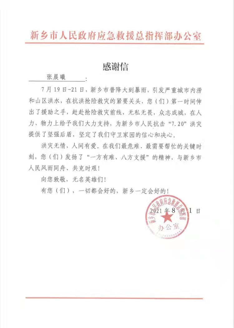 今年暑期,河南遭遇特大暴雨灾害和出现疫情反弹,我校工程与管理学院19级学生张晨曦同学积极投身抗洪救灾和疫情防控中表现突出,受到新乡市人民政府应急救援总指挥部办公室、杞县柿园乡人民政府、北京应急救援队的表扬与肯定。