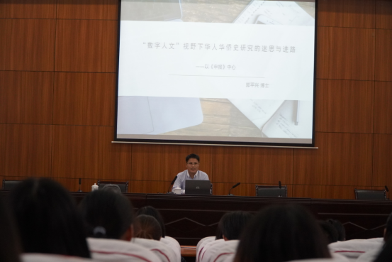 首先,郭平兴校友追忆了自己在母校读书时的美好时光,表达了对母校培育的感恩之情。接下来,他从“数字人文”兴起的时代背景、华人华侨史研究的现状、数据库的建立与选择和未来研究走向等方面为大家呈现了一场别开生面的讲座。
