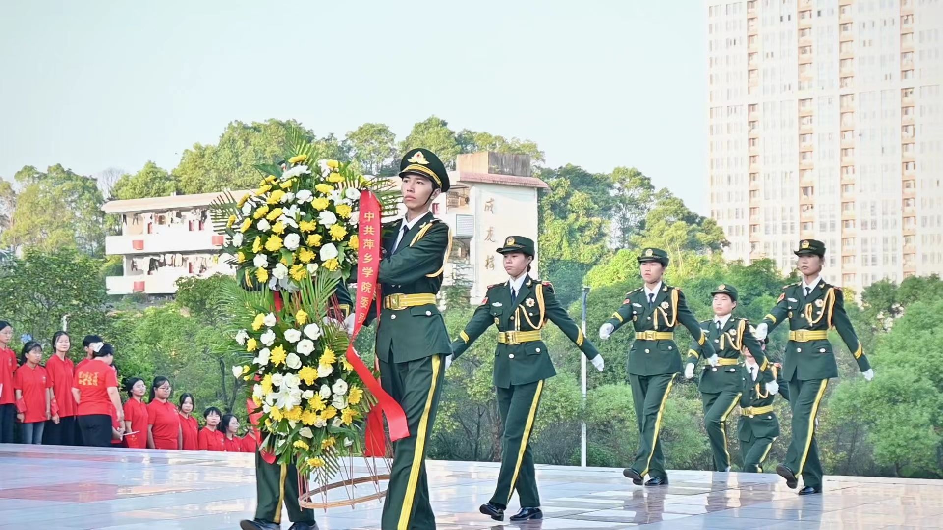 鲜花献忠魂,英名垂青史。在深沉悠长的《献花曲》中,现场气氛庄严肃穆,校国旗班礼兵托起花篮,缓步走向毛泽东铜像,将花篮轻轻摆放在毛主席铜像基座上,全体在场人员行注目礼。