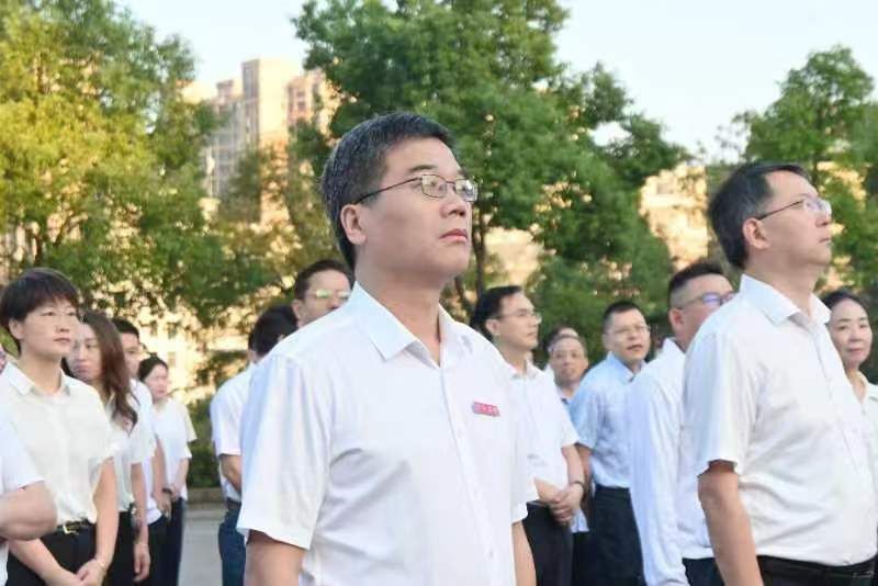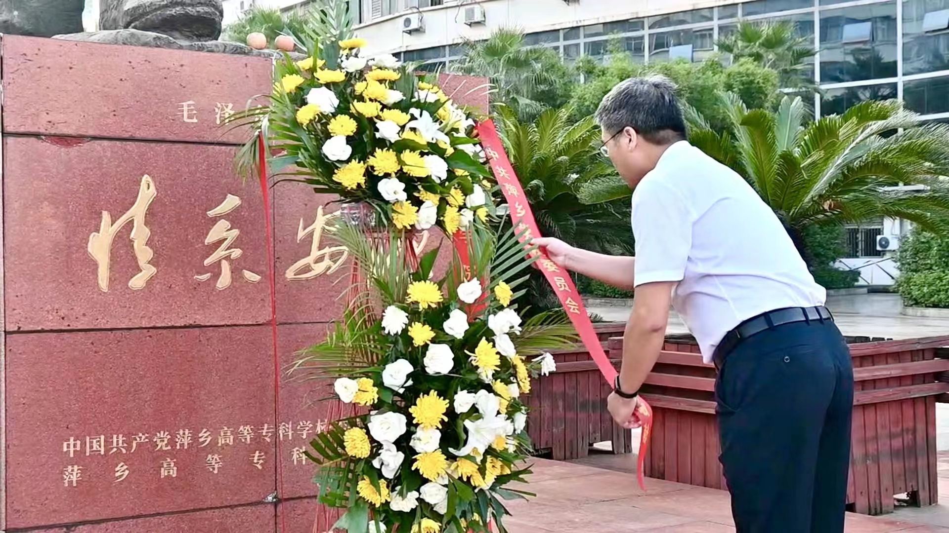 党委书记邱晓辉缓步上前,神情庄重地整理花篮上的红色缎带。全体领导干部肃立在毛主席铜像前,向主席铜像三鞠躬。随后,全体在场人员按顺时针方向,绕行毛主席铜像一周,瞻仰毛泽东同志铜像,表达对毛泽东同志和先烈英雄们的深切缅怀与崇高敬意。