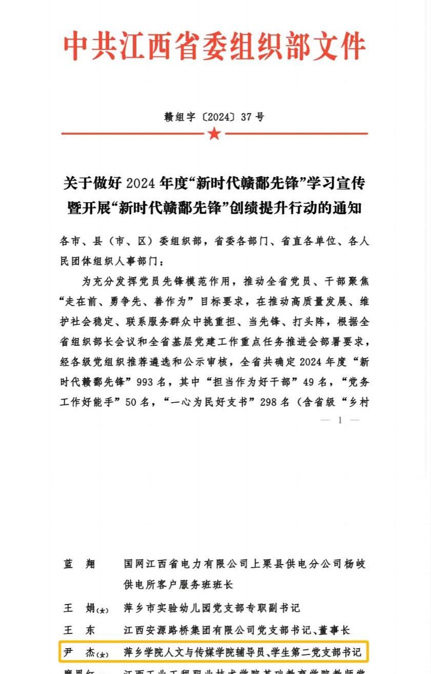 为充分发挥党员先锋模范作用,推动全省党员、干部聚焦“走在前、勇争先、善作为”目标要求,在推动高质量发展、维护社会稳定、联系服务群众中挑重担、当先锋、打头阵,近日,省委组织部公布了《2024年度“新时代赣鄱先锋”学习宣传人选名单》。萍乡学院人文与传媒学院辅导员、学生第二党支部书记尹杰被省委组织部确定为“新时代赣鄱先锋——群众身边好党员”学习宣传对象。