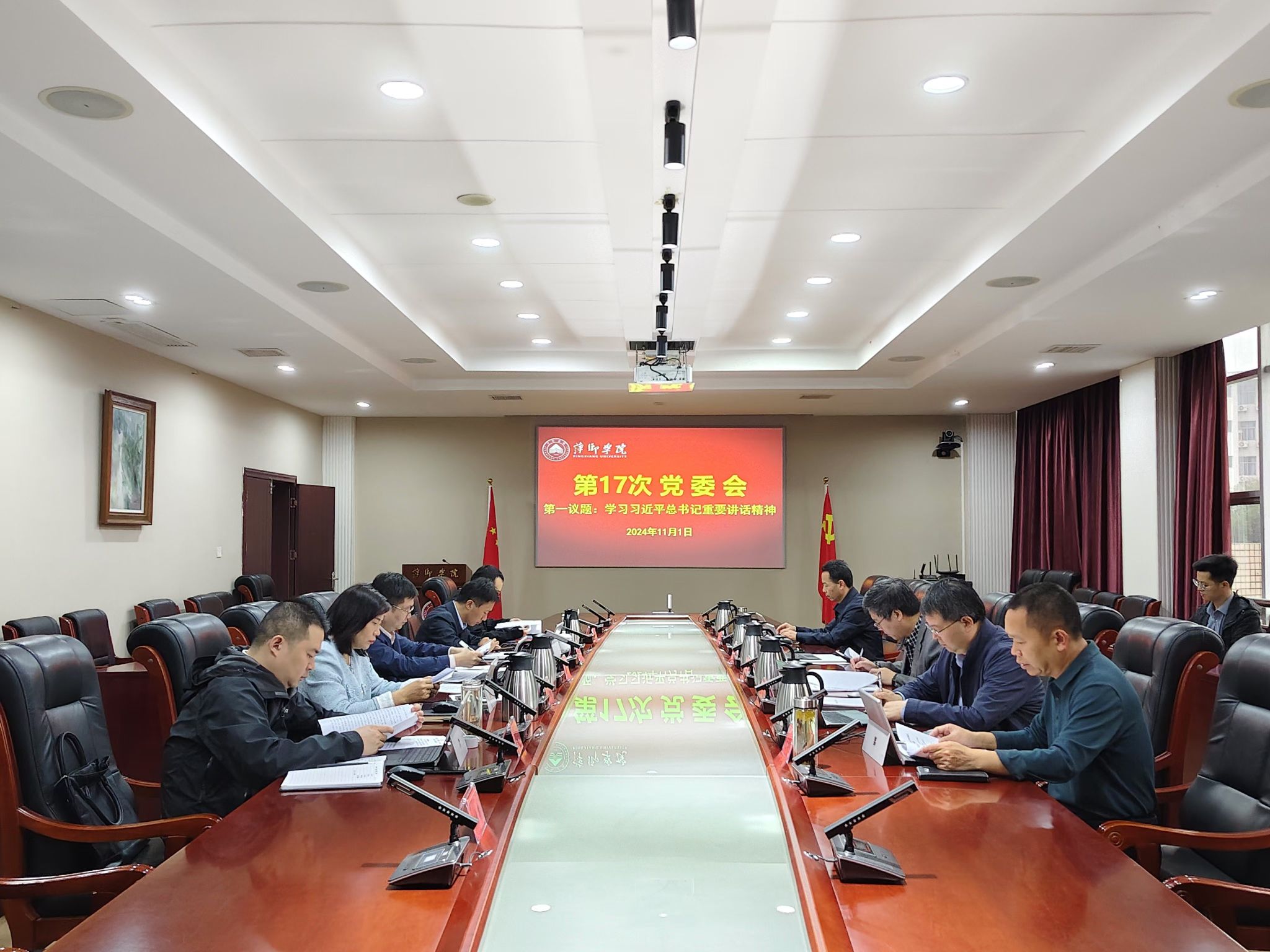 11月1日,校党委在至善楼第一会议室召开党委会“第一议题”学习会,集体深入学习《求是》杂志发表习近平总书记重要文章《在文艺工作座谈会上的讲话》;习近平总书记对全军军事理论工作会议作出重要指示;习近平主席向美中关系全国委员会 2024 年度颁奖晚宴致贺信;习近平总书记在福建考察发表重要讲话;习近平总书记回信勉励中国国际大学生创新大赛参赛学生代表;习近平总书记就组建中国资源循环集团有限公司作出重要指示;习近平总书记在安徽考察发表重要讲话;习近平总书记在视察火箭军某旅时发表重要讲话;习近平主席向2024年国际保护知识产权协会世界知识产权大会致贺信;习近平总书记对国家级经济技术开发区工作作出重要指示;习近平主席在金砖国家领导人第十六次会晤上的讲话;习近平总书记给中国海洋大学全体师生的回信;习近平总书记主持中共中央政治局会议 审议《关于二十届中央第三轮巡视情况的综合报告》;习近平总书记主持二十届中共中央政治局第十七次集体学习并发表重要讲话;习近平总书记对民政工作作出重要指示;习近平总书记关于整治形式主义为基层减负重要指示精神摘编等。学习会由校党委书记邱晓辉主持。