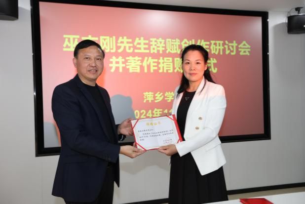 2024年11月4日,巫志刚先生辞赋创作研讨会暨著作捐赠仪式在学校天泉楼举行,以纪念著名辞赋家、萍乡市辞赋学会原会长巫志刚先生在辞赋创作领域的卓越成就。参加此次研讨会的嘉宾有香港女作家协会理事兼副秘书长戴凤萍女士,萍乡市政协常委、大唐教育董事长敖桂明,萍乡市辞赋学会会长王轶涛等萍乡文化界与教育界的知名人士。党委委员、副校长陈永国,党委委员、宣传部部长曾敏等校领导出席了此次活动。校图书馆馆长张义良主持捐赠仪式。