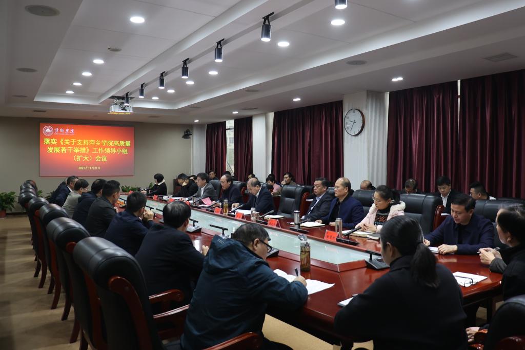 为深入贯彻全市支持学校高质量发展工作座谈会的会议精神,11月21日,我校在至善楼第一会议室召开落实《关于支持萍乡学院高质量发展若干举措》工作领导小组(扩大)会议。全体校领导出席会议,各二级学院党委书记、院长,各职能部门主要负责同志参加会议。会议由校党委书记陈金印主持。