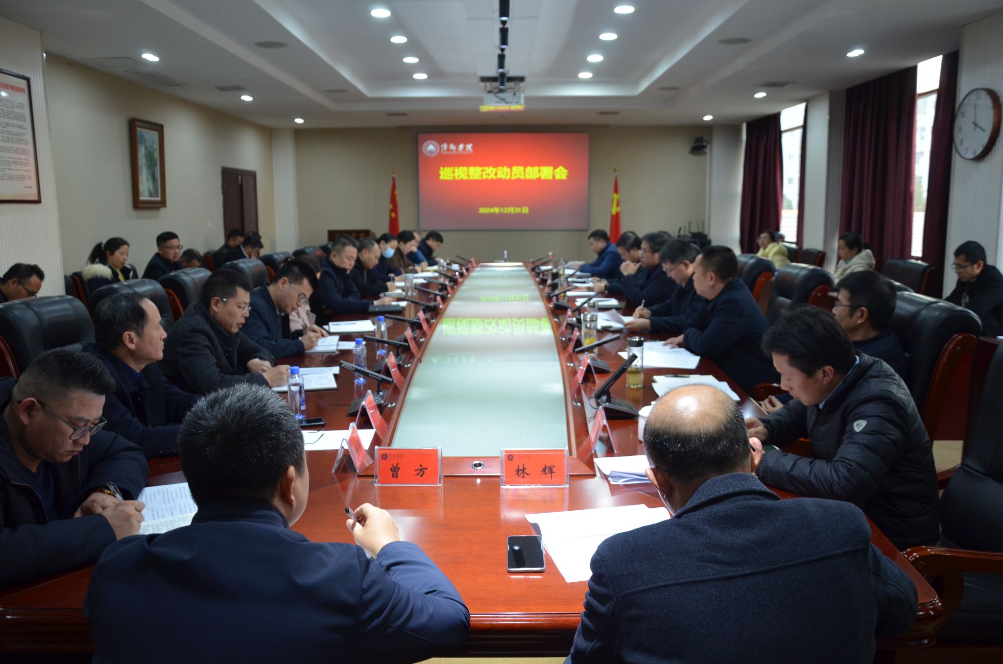 12月31日下午,学校巡视整改动员部署会在至善楼第一会议室召开,对省委第九巡视组向学校党委反馈的巡视情况进行整改动员部署。校党委书记邱晓辉主持并作部署动员讲话。全体在家校领导,各部门主要负责同志,各二级学院党委书记、院长出席会议。