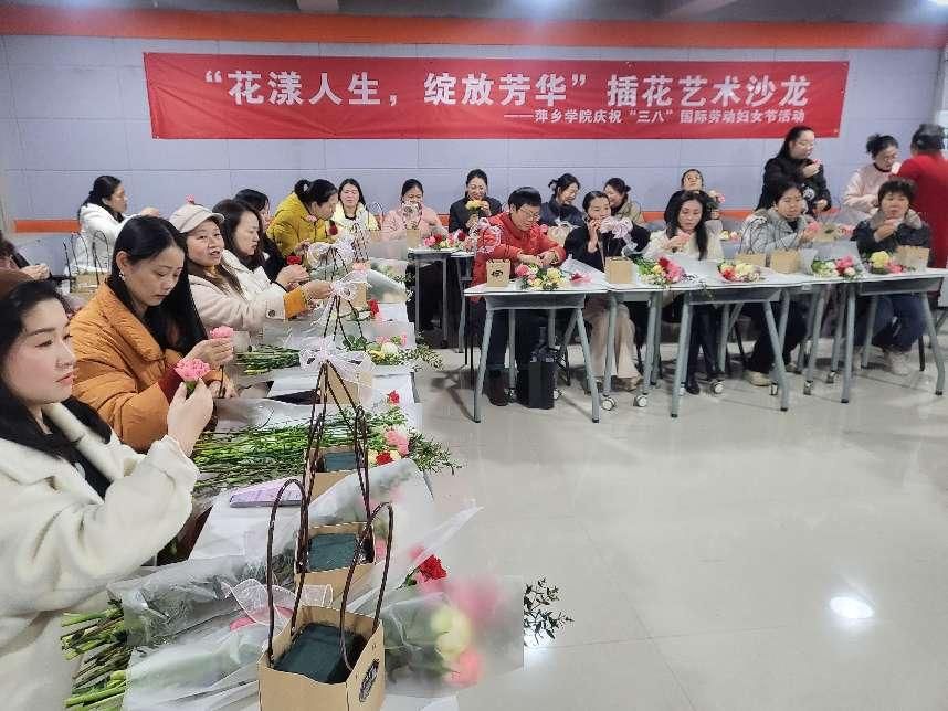 活动现场花香四溢,气氛热烈。来自全校各学院、部门的50余名女教职工齐聚一堂,在专业花艺师的指导下,将玫瑰、康乃馨、洋桔梗等鲜花精心搭配,创作出一个个错落有致、生机盎然的花艺作品。每一件作品都凝聚着女教职工们对美的追求和对生活的热爱。