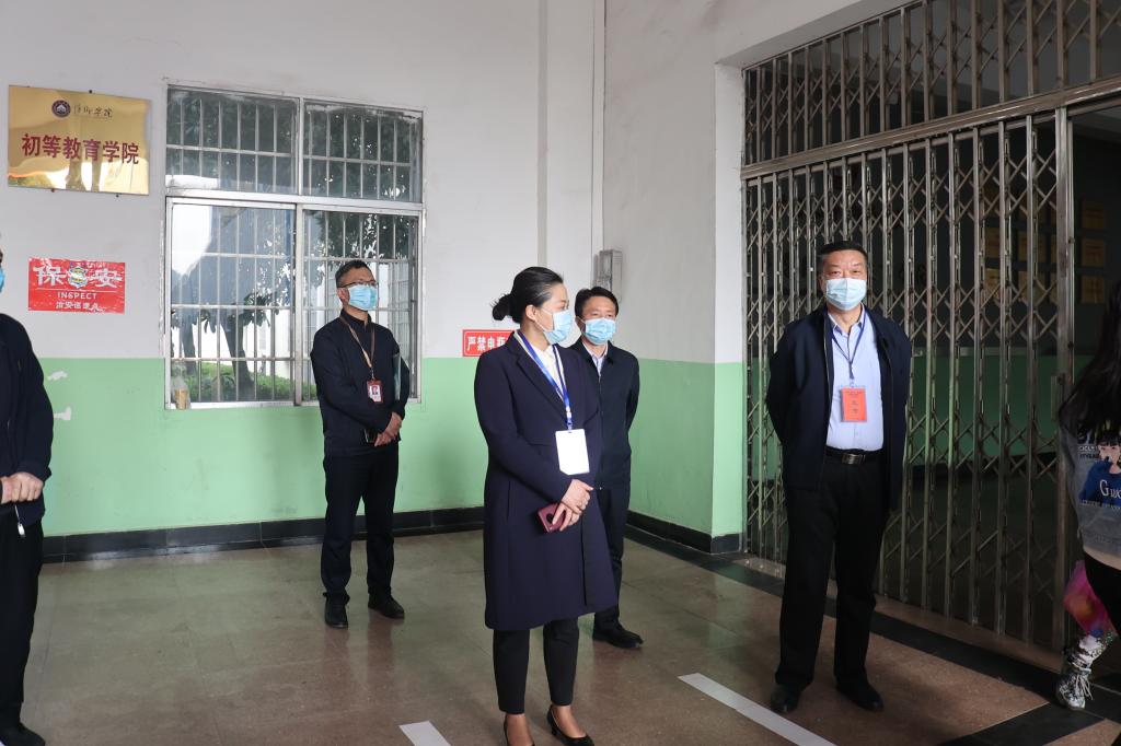 朱艳珍一行检查了我校在中小学教师资格证考试中疫情防控工作的落实情况,察看了考点疫情防控检查点、应急考场、考务工作办公室、考场监控室等场所,听取了我校党委委员、副校长郭伟关于疫情防控工作、考务工作等工作汇报。