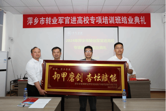 2025年5月6日上午,2024年萍乡市转业军官进高校专项培训班结业典礼在萍乡学院鼎新楼继续教育学院培训室举行,校党委委员、副校长黄志开,萍乡市退役军人事务局党组书记、局长龙军,萍乡市退役军人事务局党组成员、副局长何世萍,继续教育学院党总支书记肖国正出席,继续教育学院院长黄红华主持。