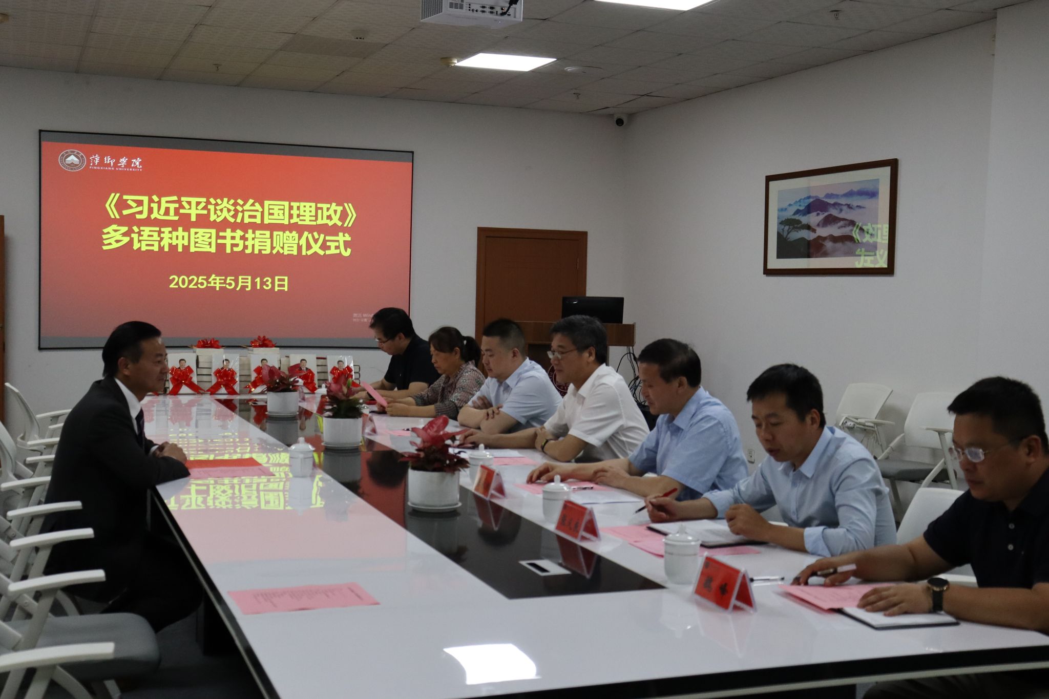 5月13日,《习近平谈治国理政》多语种图书捐赠仪式在我校图书馆二楼会议室举行。北京崇学文化发展有限公司总经理余富文,校党委书记邱晓辉等领导出席捐赠仪式。校党委委员、副校长陈永国主持捐赠仪式。邱晓辉代表学校向余富文先生颁发捐赠证书。学校党政办公室、党委宣传部、马克思主义学院、国际教育与交流中心、图书馆等部门负责人共同参加捐赠仪式。
