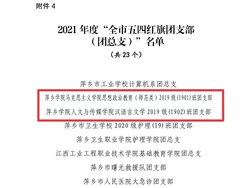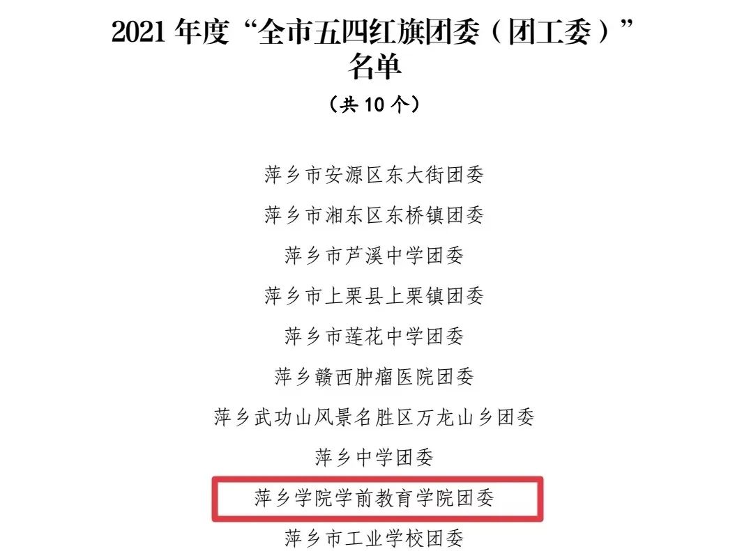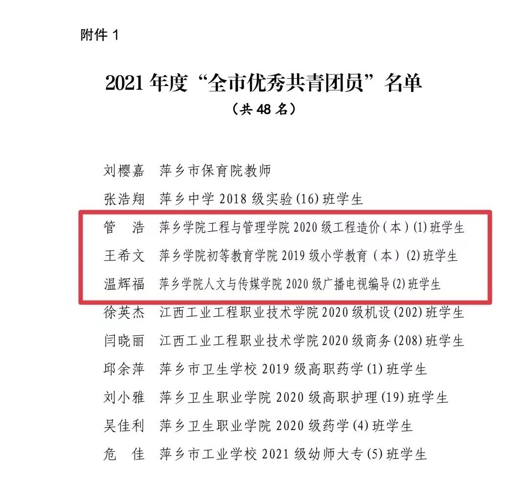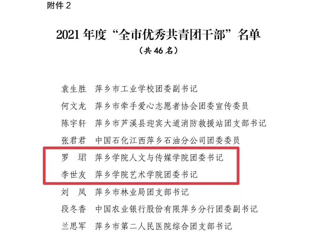 近日,共青团萍乡市委公布了2021年度表彰全市“两红两优”的名单。其中,我校工管学院学生管浩、初教学院学生王希文、文传学院学生温辉福荣获“全市优秀共青团员”荣誉称号;文传学院团委书记罗珺、艺院团委书记李世友荣获“全市优秀共青团干部”荣誉称号;学前教育学院团委荣获“全市五四红旗团委(团工委)”荣誉称号;马克思主义学院思想政治教育(师范类)2019级(1901)班团支部、人文与传媒学院汉语言文学2019级(1902)班团支部荣获“全市五四红旗团支部(团总支)”荣誉称号。