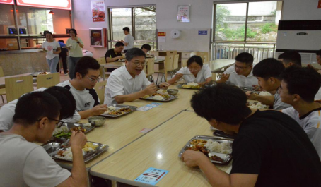 随后,邱晓辉来到学校食堂,与同学们一同排队打饭、同桌用餐。用餐过程中,他亲切询问同学们饭菜口味、价格和营养搭配等情况,认真倾听同学们对食堂服务的意见建议,叮嘱食堂工作人员要不断提升餐饮质量,为同学们提供安全、卫生、美味的饮食服务。