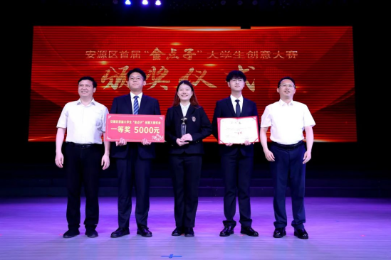 区委常委、副区长袁子安,我校创新创业学院谢伟萍院长为安源区首届“金点子”大学生创意大赛塑烯科技(二等奖)颁奖。